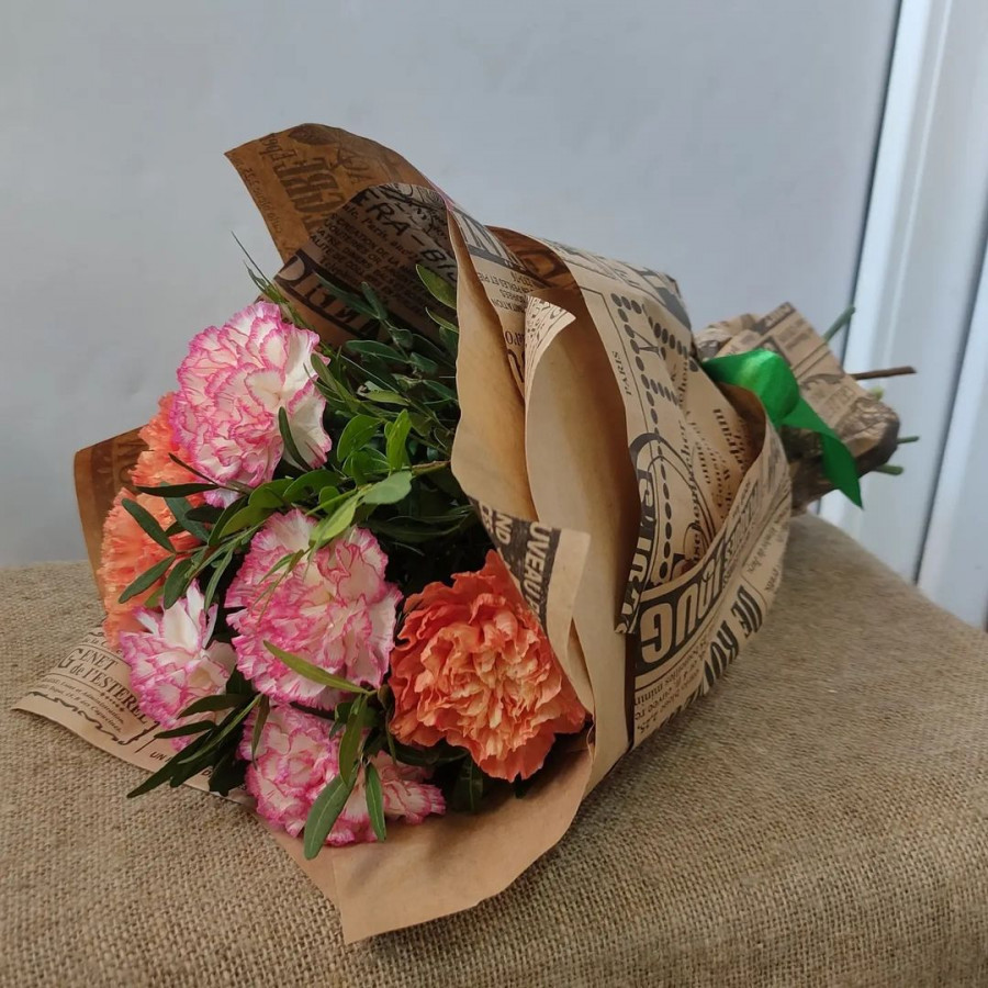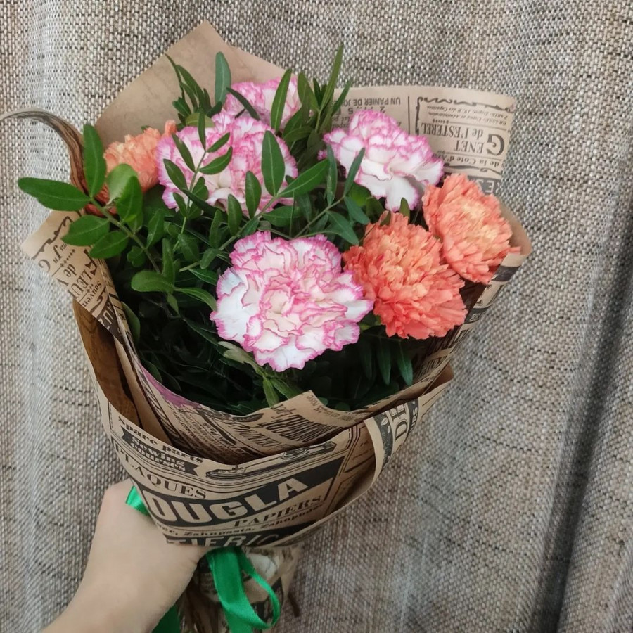 На фото букет из 7 разноцветных гвоздик. В составе: гвоздика 7 шт, писташ 2 шт, крафт-бумага 1 шт, атласная лента 1 шт, . Все цветы свежие и ароматные, букет красиво оформлен и отлично подходит для подарка. Доступна доставка цветов или самовывоз.