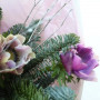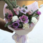 На фото букет из фиолетовых анемонов. В составе: анемон 7 шт, гвоздика 3 шт, нобилис 2 шт, крафт-бумага 1 шт, атласная лента 1 шт, . Все цветы свежие и ароматные, букет красиво оформлен и отлично подходит для подарка. Доступна доставка цветов или самовывоз.