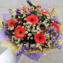 На фото букет из гербер и ромашек. В составе: гербера 7 шт, танацетум 5 шт, статица 4 шт, гиперикум 2 шт, крафт-бумага 1 шт, атласная лента 1 шт, . Все цветы свежие и ароматные, букет красиво оформлен и отлично подходит для подарка. Доступна доставка цветов или самовывоз.