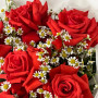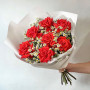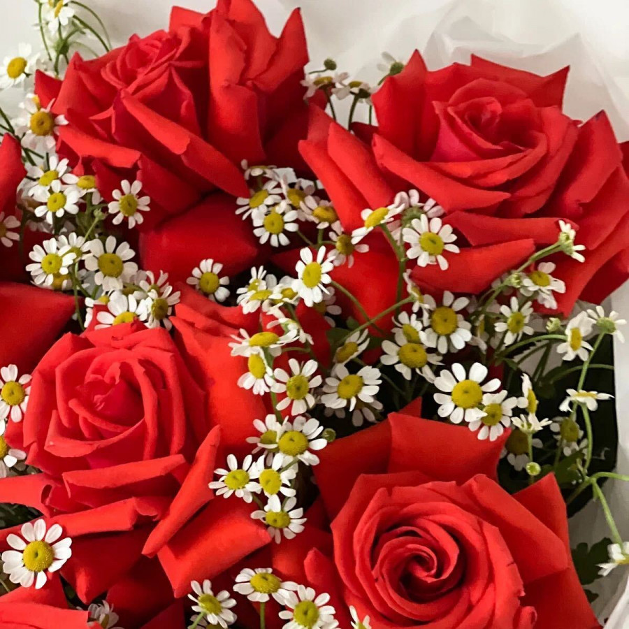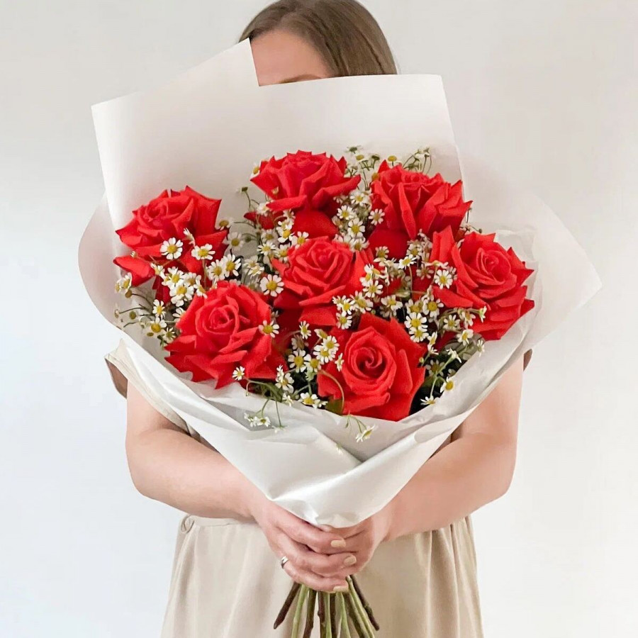 На фото букет из ромашек и красных роз. В составе: ромашки 4 шт, роза 7 шт, крафт-бумага 1 шт, атласная лента 1 шт, . Все цветы свежие и ароматные, букет красиво оформлен и отлично подходит для подарка. Доступна доставка цветов или самовывоз.