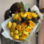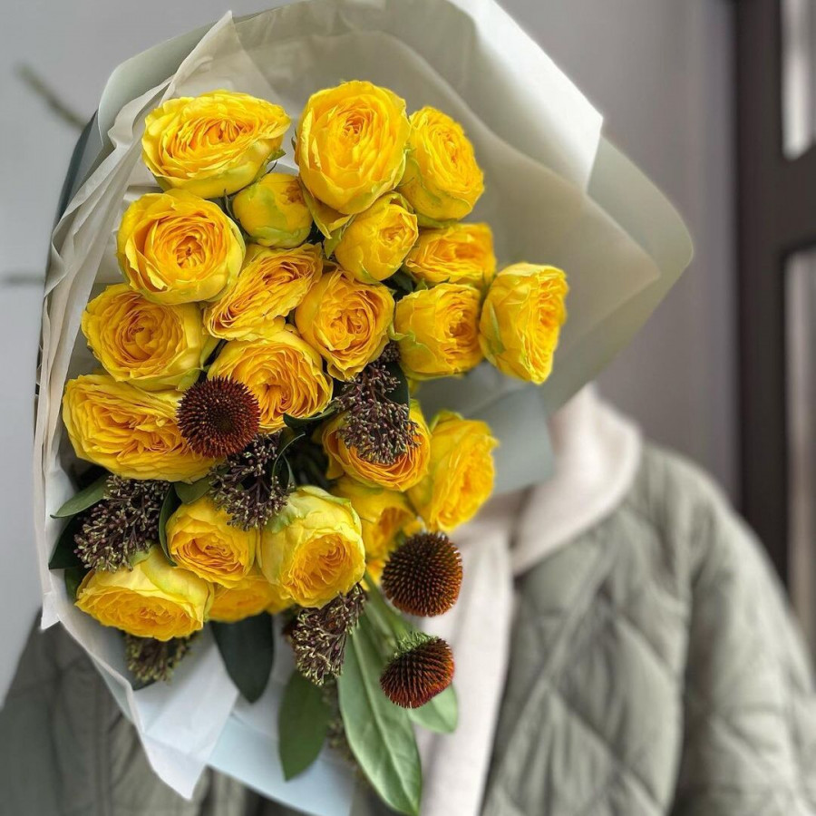 На фото букет из желтых пионовидных роз. В составе: кустовая пионовидная роза 13 шт, эхинацея 2 шт, скиммия 2 шт, . Все цветы свежие и ароматные, букет красиво оформлен и отлично подходит для подарка. Доступна доставка цветов или самовывоз.