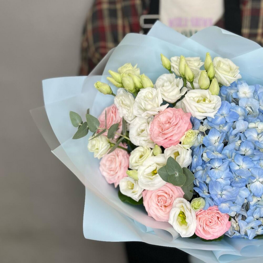 На фото букет «ледяная акварель». В составе: гортензия 1 шт, кустовая пионовидная роза 4 шт, эустома (лизиантус) 3 шт, эвкалипт 3 шт, дизайнерская упаковка 1 шт, атласная лента 1 шт, . Все цветы свежие и ароматные, букет красиво оформлен и отлично подходит для подарка. Доступна доставка цветов или самовывоз.