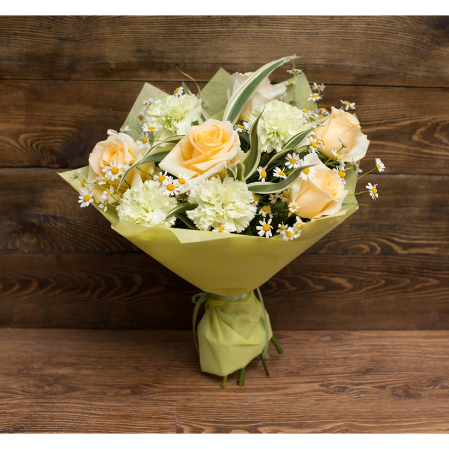 Если Вы хотите удивить свою любимую женщину, рекомендуем остановить выбор на букете «Ванильные облака», которые обязательно покорят сердце даже самой взыскательной леди. Композиция составляется из пяти свежесрезанных роз, гвоздик, милых матрекарий и ярко зеленой декоративной зелени. Элегантный, утонченный и изысканный  внешний вид непревзойденный по аромат привнесет в жизнь Вашей женщины массу позитива.