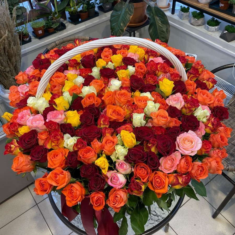 На фото композиция из 251 розы в белой корзине. В составе: роза 251 шт, корзина (xl) 1 шт, . Все цветы свежие и ароматные, букет красиво оформлен и отлично подходит для подарка. Доступна доставка цветов или самовывоз.