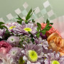 На фото сборный букет с кустовой розой. В составе: кустовая роза 3 шт, роза 3 шт, хризантема кустовая 3 шт, эустома (лизиантус) 2 шт, писташ 3 шт, крафт-бумага 1 шт, атласная лента 1 шт, . Все цветы свежие и ароматные, букет красиво оформлен и отлично подходит для подарка. Доступна доставка цветов или самовывоз.
